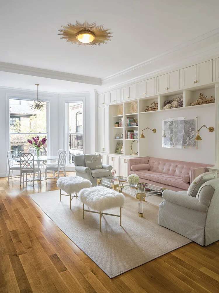 From there, though, the scope of the project expanded and the homeowners looked to Vieira to pull together a cohesive design that allowed the home’s original architectural details to shine but was also fresh, clean, and skewed a touch midcentury modern. The inspiration started simply with a Jonathan Adler sofa swathed in a blush-pink Romo fabric. “I just knew that I wanted a pink couch,” says the homeowner, laughing, who purchased the piece prior to Vieira’s involvement. But the homeowner’s taste in the midcentury modern–inspired sofa aligned perfectly with the designer’s style, resulting in a complementary pairing that would extend throughout the design process.