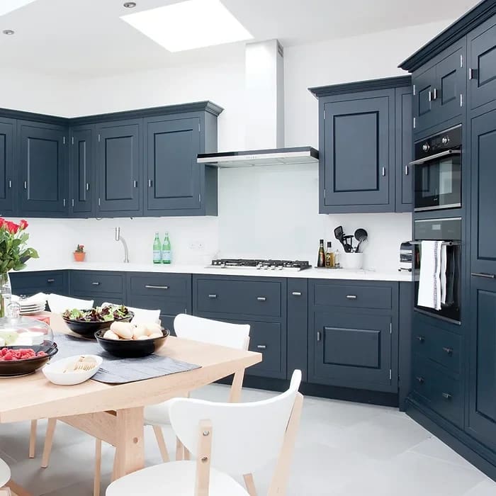 The kitchen measures fifteen feet three inches by fourteen feet nine inches, and the space beyond the spiral staircase measures thirteen feet by nine feet three inches. “This gave the option to have the table in the body of the kitchen or beyond at the window for the sea view,” says Howard. “It also gave them the flexibility of adding in a kitchen island at a later date as the table fits easily in the space beyond the staircase.”