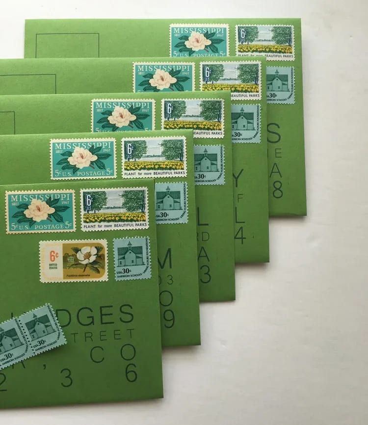You can find usable stamps from Vintage Postage Shop and other vendors on Etsy. If you’d like someone else to curate a complete set and make sure it totals the amount you need per envelope, Etsy is a fantastic resource. Or if you’re simply on the hunt for sheets of a specific stamp, you can check out eBay or Amazon. There might also be local brick-and-mortar resources in your area.